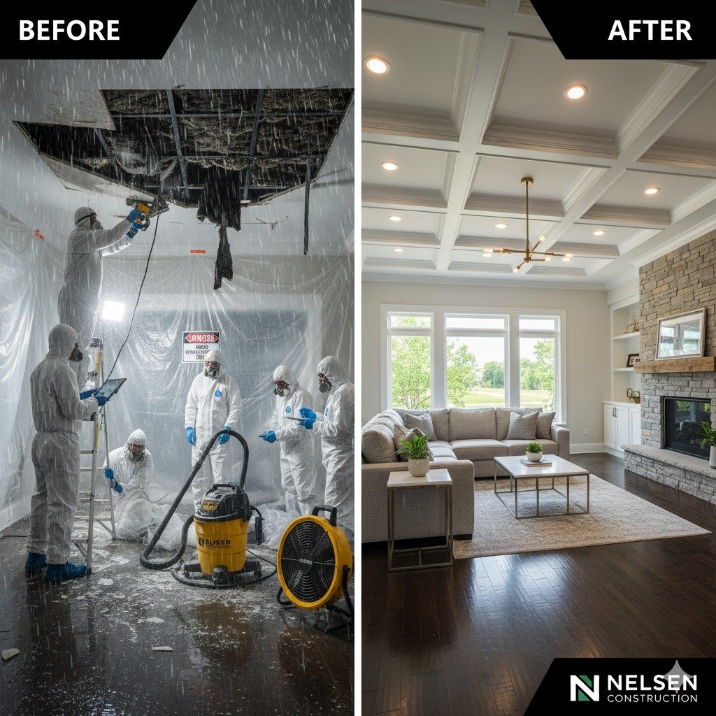Safety first. Ensure everyone is out of harm's way and turn off utilities if safe to do so. Then, call Nelsen Construction for emergency mitigation. Quick action prevents small leaks from becoming major mold or structural issues.